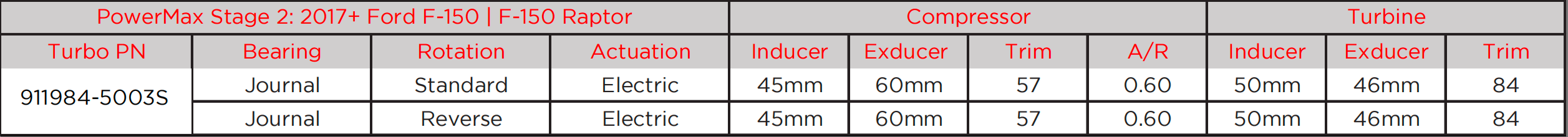 The Garrett PowerMax™ Stage 2 turbocharger upgrade for the 2017 - 2021 F-150 and F-150 Raptor platform is engineered to increase engine performance capability while maintaining OEM installation specifications. This direct drop-in Stage 2 upgrade provides 54% more flow than OEM and will support up to 700+ BHP*. Improvements in compressor efficiency and flow can be attributed to the 60mm fully-machined compressor wheel. Turbine flow is increased by 52% compared to OEM with a 50mm Inconel turbine wheel and larger 0.45 A/R turbine housing. This turbocharger kit comes fully assembled, calibrated, and is outline interchangeable with the OE hardware to ensure a perfect fit every time.