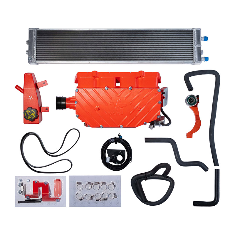 The VT supercharger kit includes: supercharger body (730cc), intake manifold, mid-mounted water cooler, kettle, water pump, water-cooled radiator, belt, idler, water pipe, intake pipeline, bracket, ECU program and other related accessories.