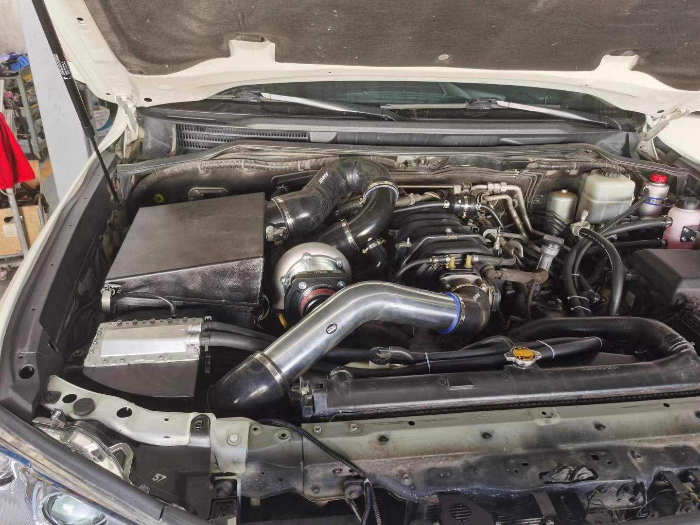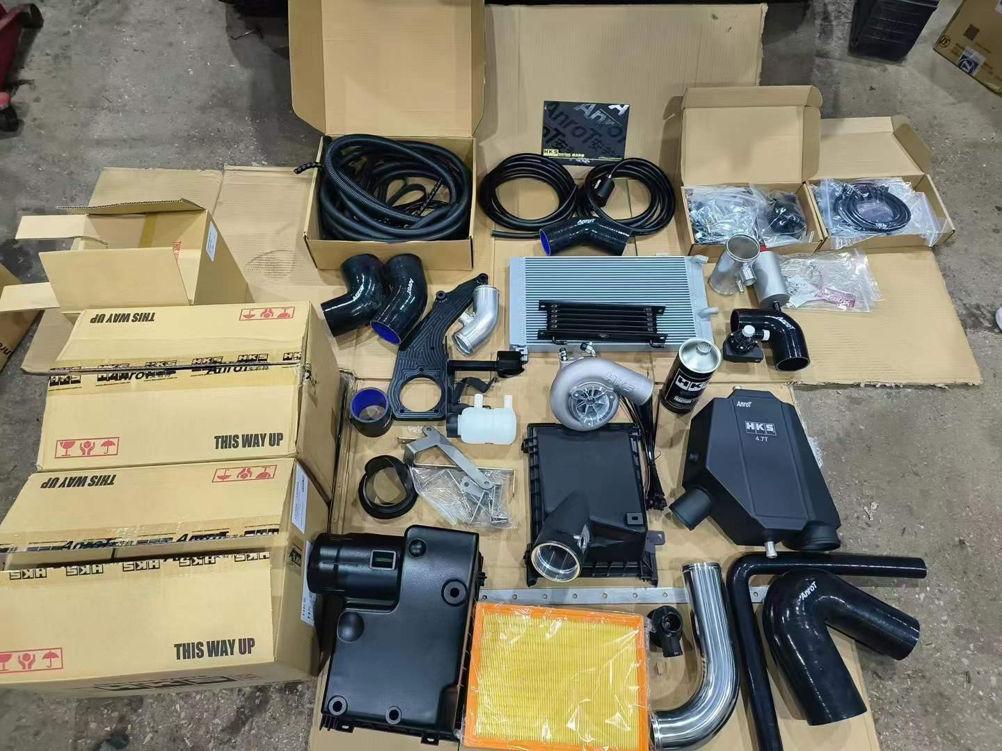 Complete HKS supercharger kit includes: HKS GTS8555 supercharger body, oil pot, oil filter, oil cooler, oil pipe, HKS oil, air cooling water tank, air water cooling radiator, water pipe, water pump, air intake pipeline, pressure relief valve, CNC supercharger bracket and accessories Custom CNC bracket etc.