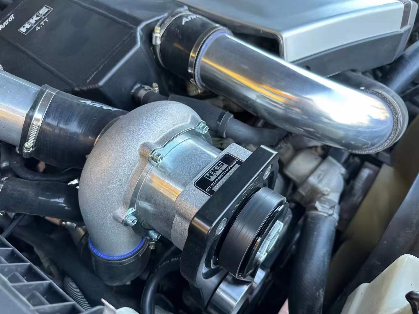 Complete HKS supercharger kit includes: HKS GTS8555 supercharger body, oil pot, oil filter, oil cooler, oil pipe, HKS oil, air cooling water tank, air water cooling radiator, water pipe, water pump, air intake pipeline, pressure relief valve, CNC supercharger bracket and accessories Custom CNC bracket etc.